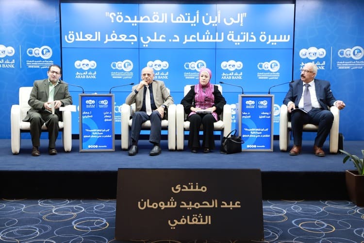 عمان (بي إف نيوز)- – أشهر الشاعر العراقي الدكتور علي جعفر العلاق، في منتدى عبد الحميد شومان، مساء الأحد، سيرته الذاتية، “إلى أين أيتها القصيدة؟”، خلال حفل تحدث فيه الشاعر يوسف عبد العزيز، والشاعرة الدكتورة مها العتوم، وأداره الكاتب جعفر العقيلي، بحضور جمع من المثقفين والأكاديميين.